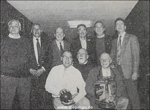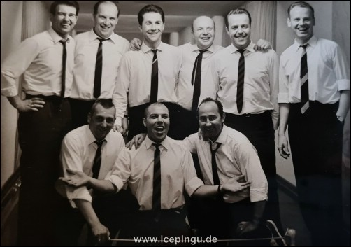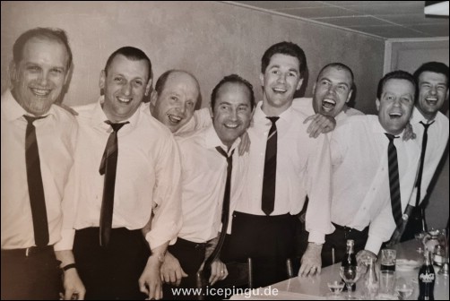 Die 14 Männer zwischen 30 und 40 hatten alle das, was man eine sportliche Figur nennt. Zweifellos hatten einige der Eishockeyspieler, die noch vor wenigen Jahren Ansporn für den Nachwuchs waren, eine leichte Oberflächenverstärkung über den Rippen angesetzt - aber das war minimal. Ihr Temperament hatte mit den Jahren, da sie den Schläger an den berühmten Nagel hängten, nicht nachgelassen. Da mußte sich der "Charlie" oft des überraschend auftauchenden Schwammes erwehren, da saß "Karo" plötzlich auf einem Aschenbecher.